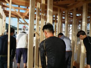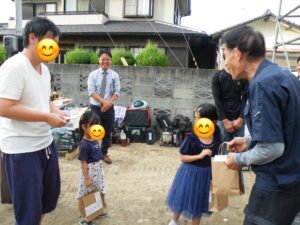 上棟式の最後には姉妹ちゃんたちが職人さん1人1人にご挨拶をしてくれたりと